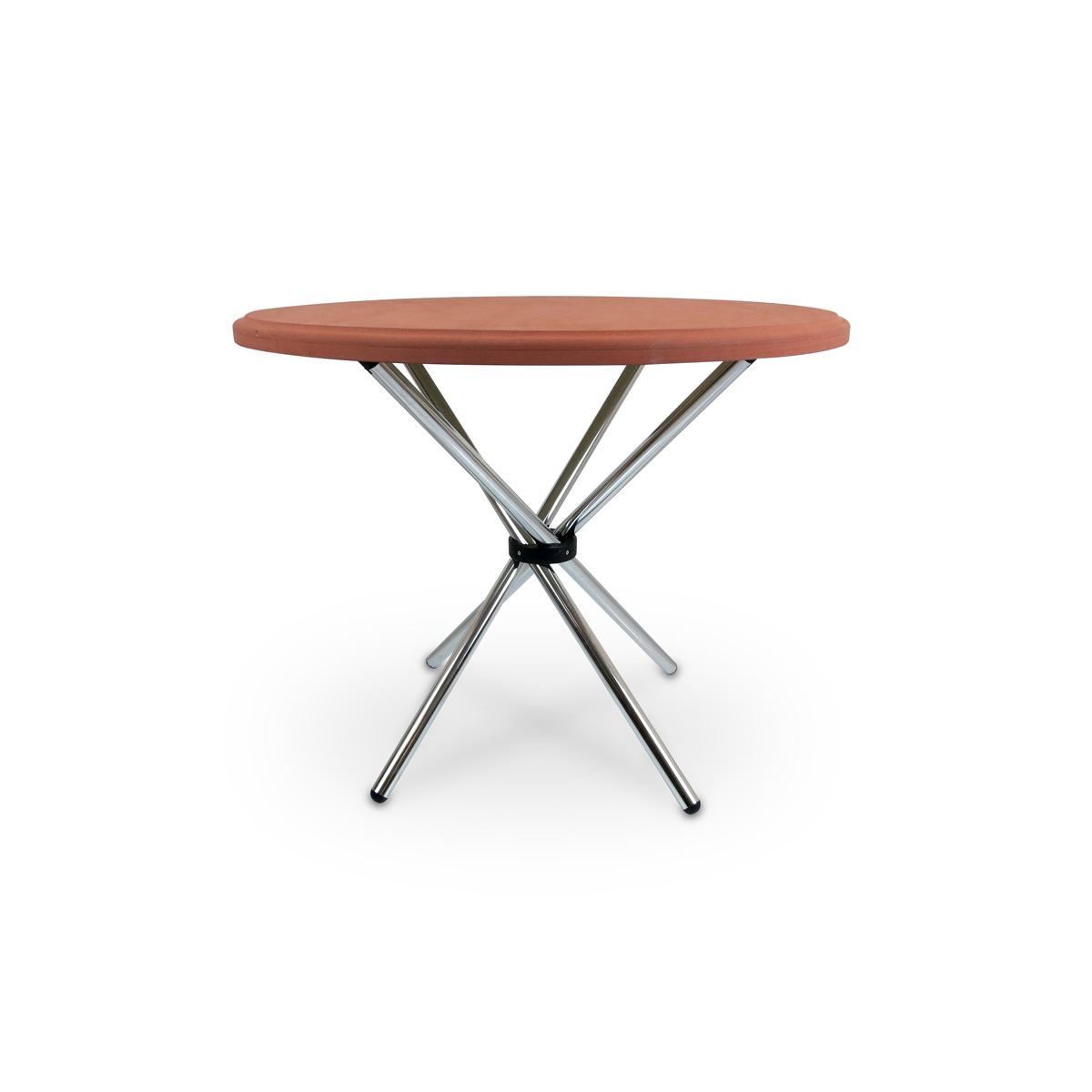 This elegant Sandstone table was crafted with a outdoor patio setting in mind but can also be set as an indoor meeting place. It’s spiraling chrome base was hand picked to compliment it’s deep crimson tones.